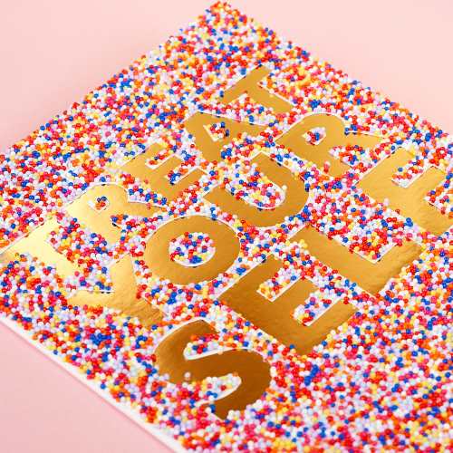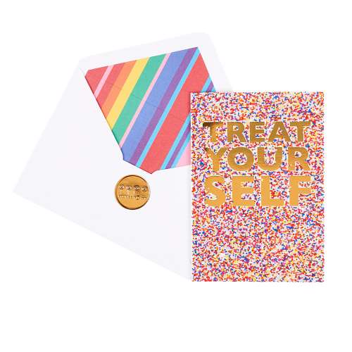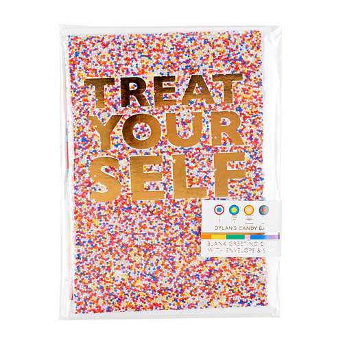 Rainbow sprinkles, yes, real rainbow sprinkles, cover the entire front cover of this card. Topped with gold foil printing this textured card will make you smile and want a cupcake at the same time. The Treat Yourself greeting card, a collaboration between Dylan's Candy Bar and The Gift Wrap Company, is sweet, colorful, and playful. Life's too serious, add some sprinkles to it!
