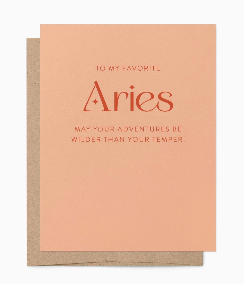 Peach greeting card with the text "to my favorite Aries, may your adventures be wilder than your temper" with a brown envelope