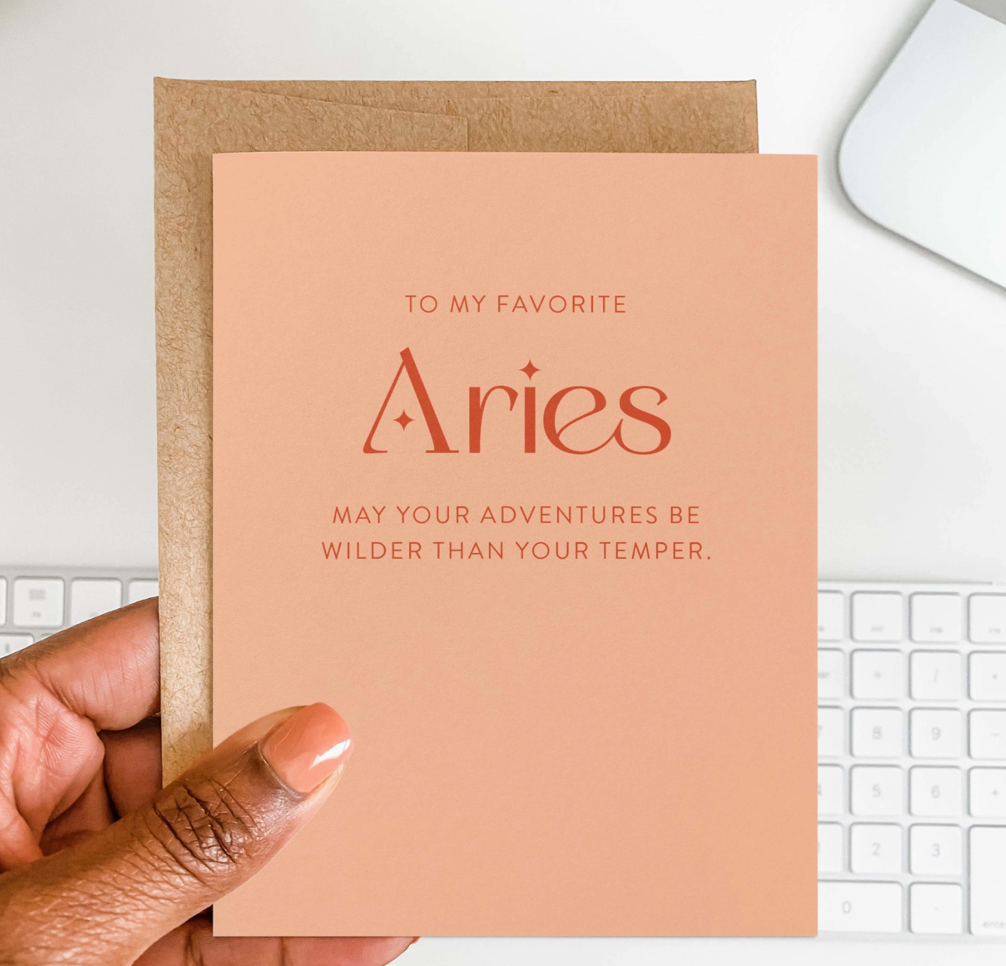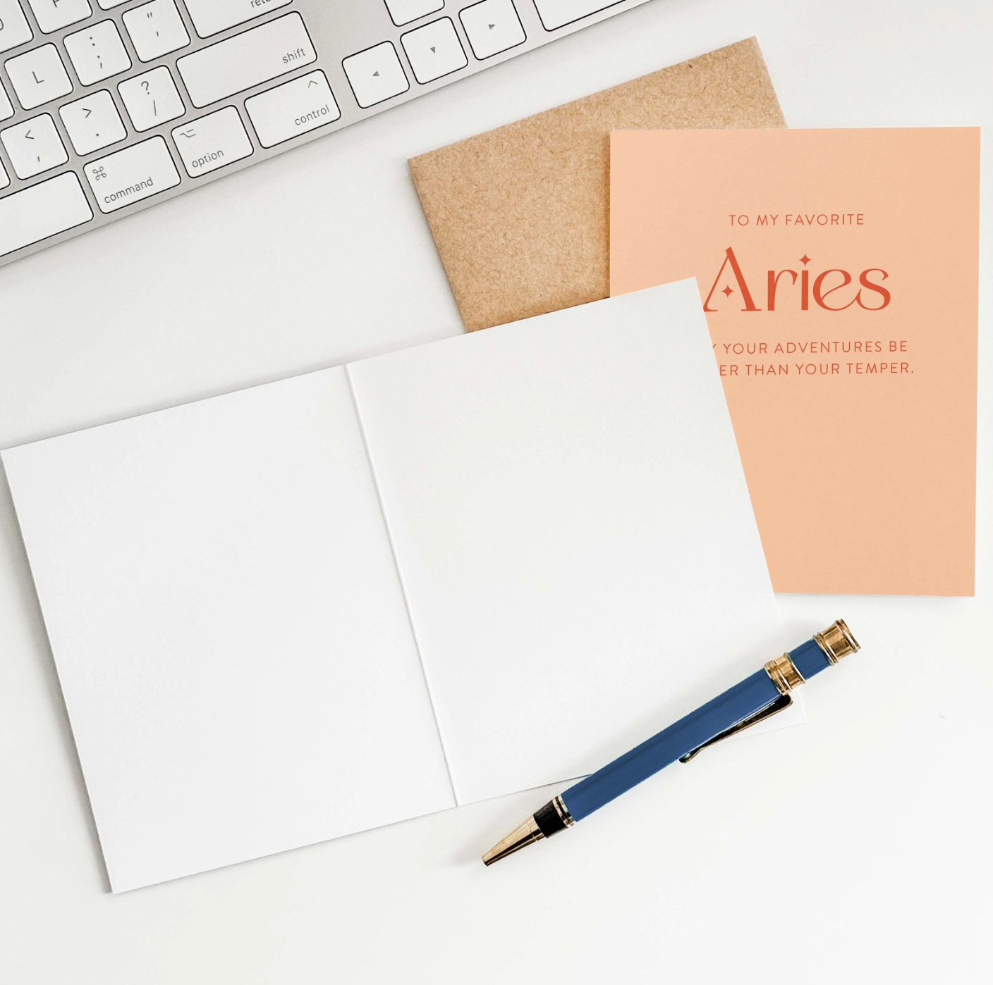 Peach greeting card with the text "to my favorite Aries, may your adventures be wilder than your temper" with a brown envelope, an open greeting card showing blank pages, a pen, and a partial view of a keyboard.