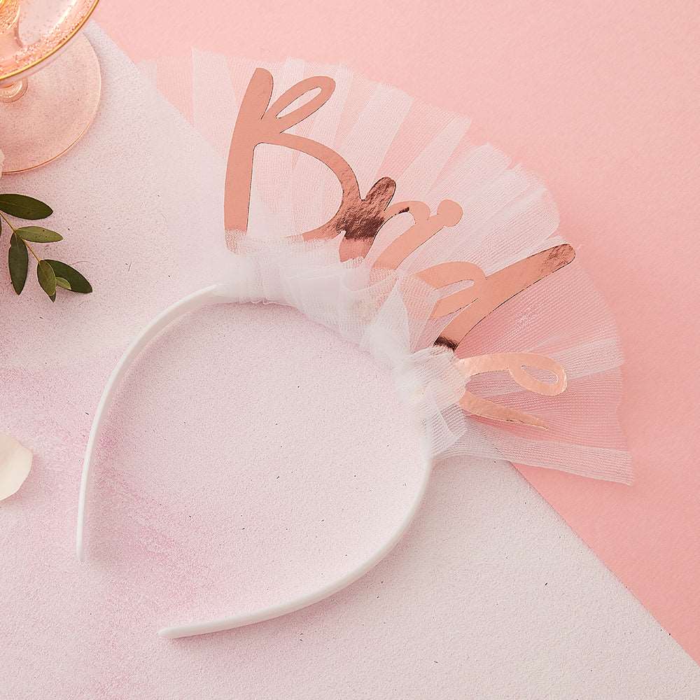 White headband wrapped in white tulle with bride in rose gold individual letters on top