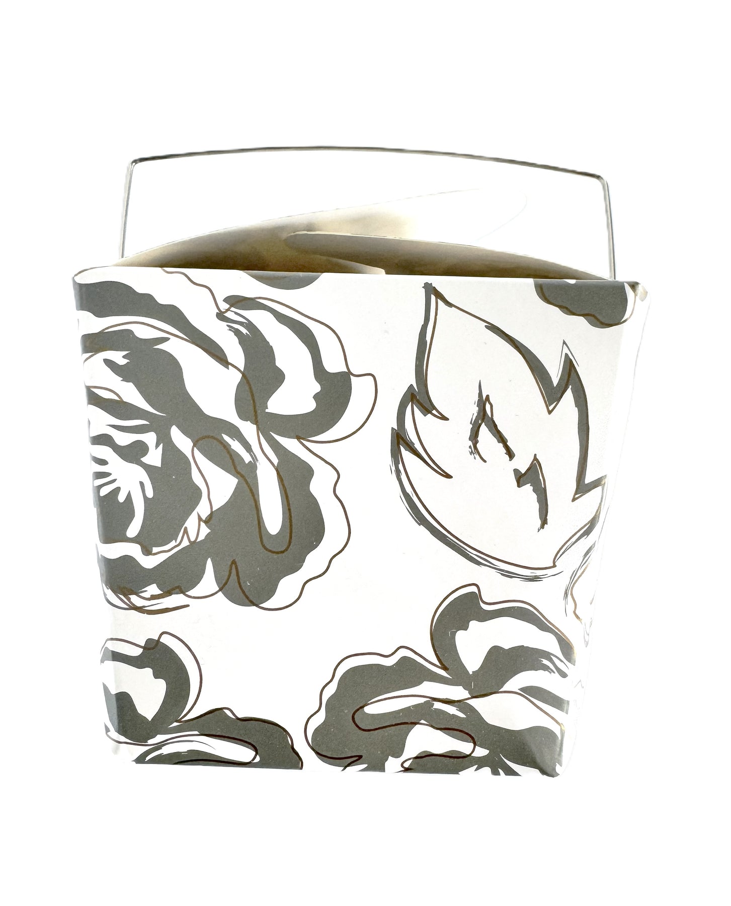A close-up image of a white take-out style box with an allover silver and gold floral pattern.