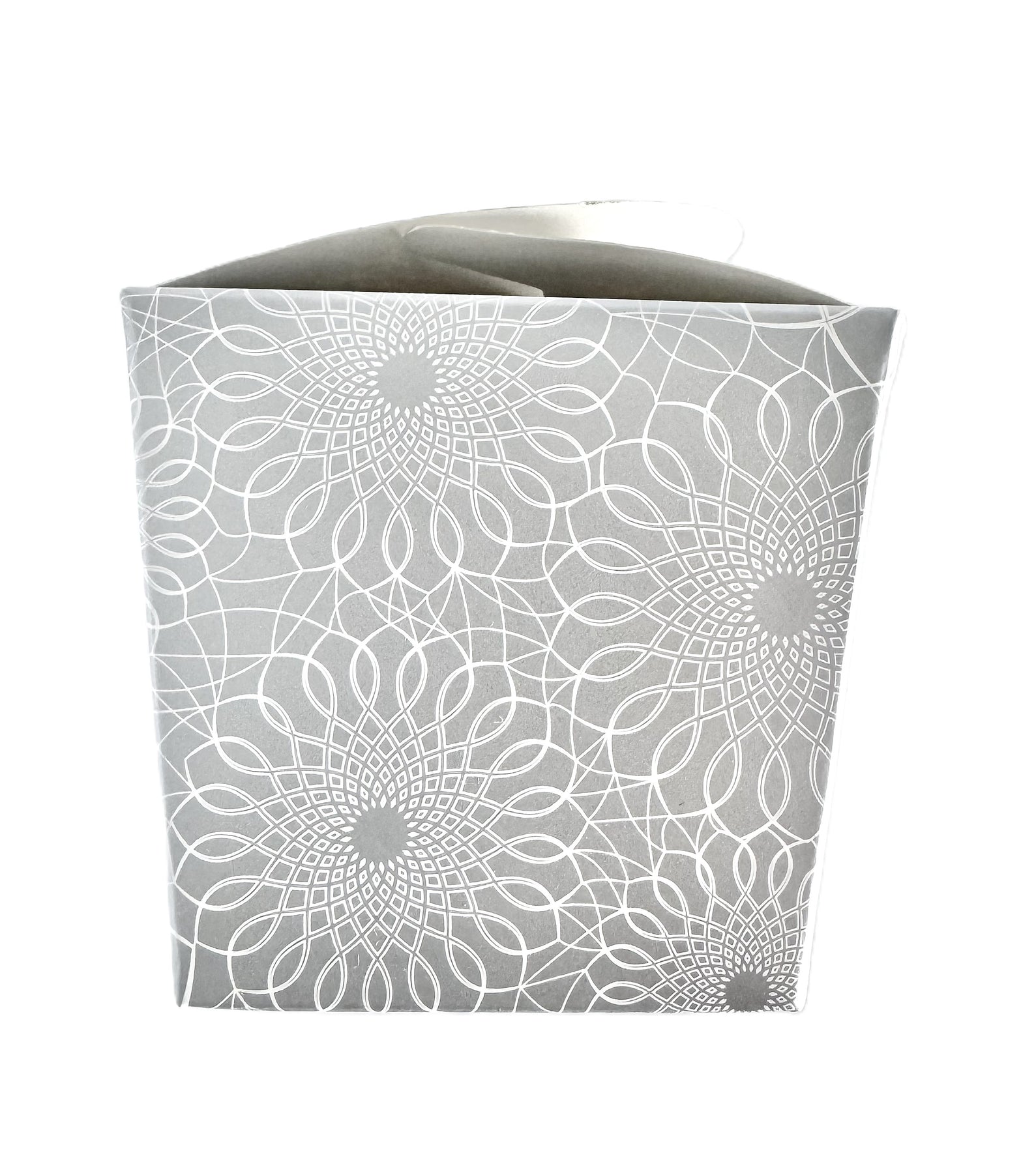 A close-up image of a silver take-out style box with an allover white printed scroll pattern.