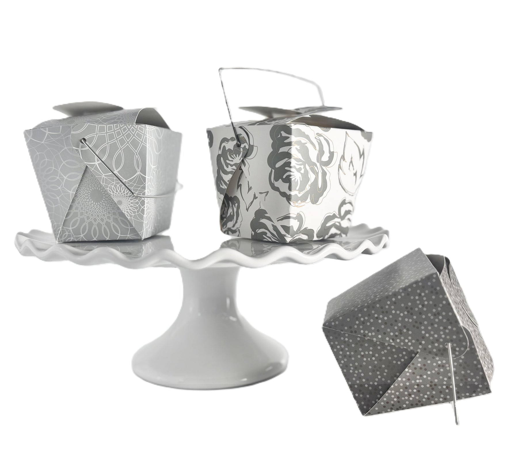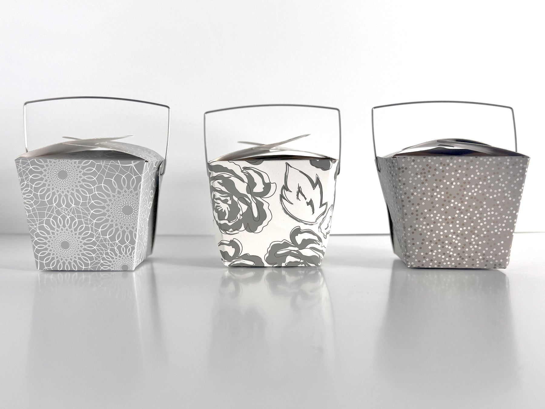 Your guests will love these charming favor take-out style boxes! With 3 unique designs included; a stunning grey and gold floral print, a sophisticated silver and white scroll pattern, and a modern charcoal grey with a colorful tonal grey and got polka dot pattern, these boxes are the perfect addition to any occasion, especially a wedding.