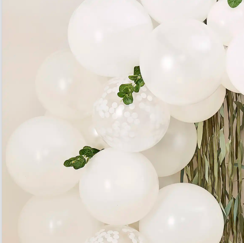 The set includes 45 white and pearl latex balloons and white confetti balloons in two sizes (12inch and 5inch), as well as 6 Eucalyptus Foliage sprigs and 9 feet of balloon tape.