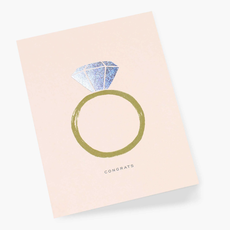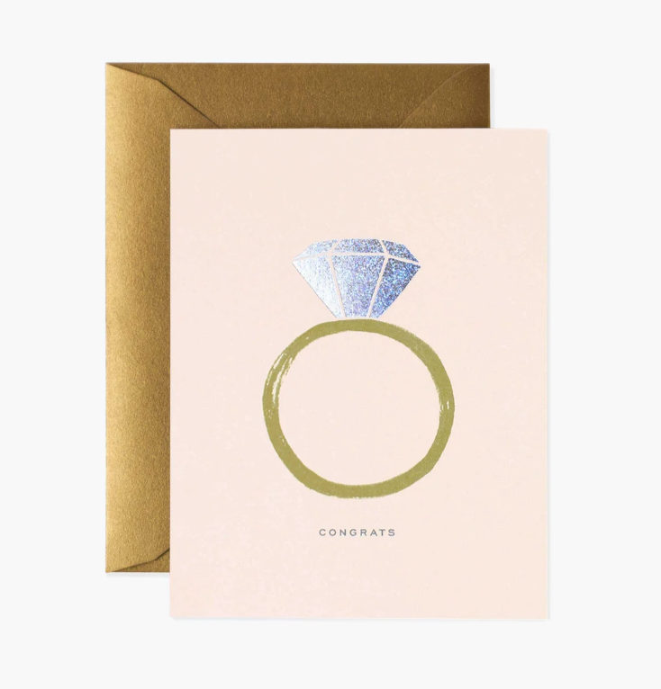 Celebrate the newly engaged couple with this stunning greeting card. The engagement ring illustration with gold band and irridescent print diamond is simple yet striking. The included metallic bronze envelope adds an extra touch of elegance. Blank inside for you to convey your joy for their annoucement.