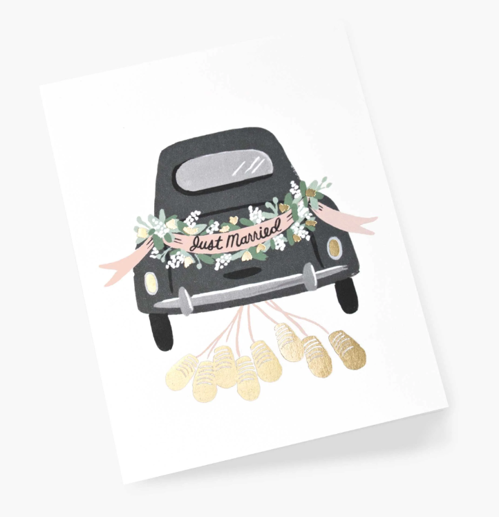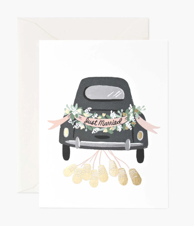 Honor the newly married couple with this classic greeting card. Showcasing a timeless vintage car illustration adorned with romantic floral details and trailing metallic gold tin cans. The playful "Just Married" banner across the trunk captures the joy and excitement of their special day. This whimsical design is the perfect way to send your warmest wishes as they embark on their adventure together.