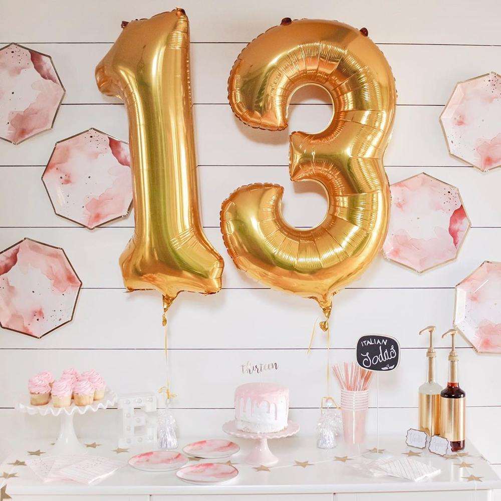 A white dessert bar with white and pink cake stands topped with pink frosted cupcakes and cakes, pink iridescent cups and matching straws, a gold star banner and syrup bottles. tonal pink, white, and gold plates decorating the wall above with gold ballons that read the number 13