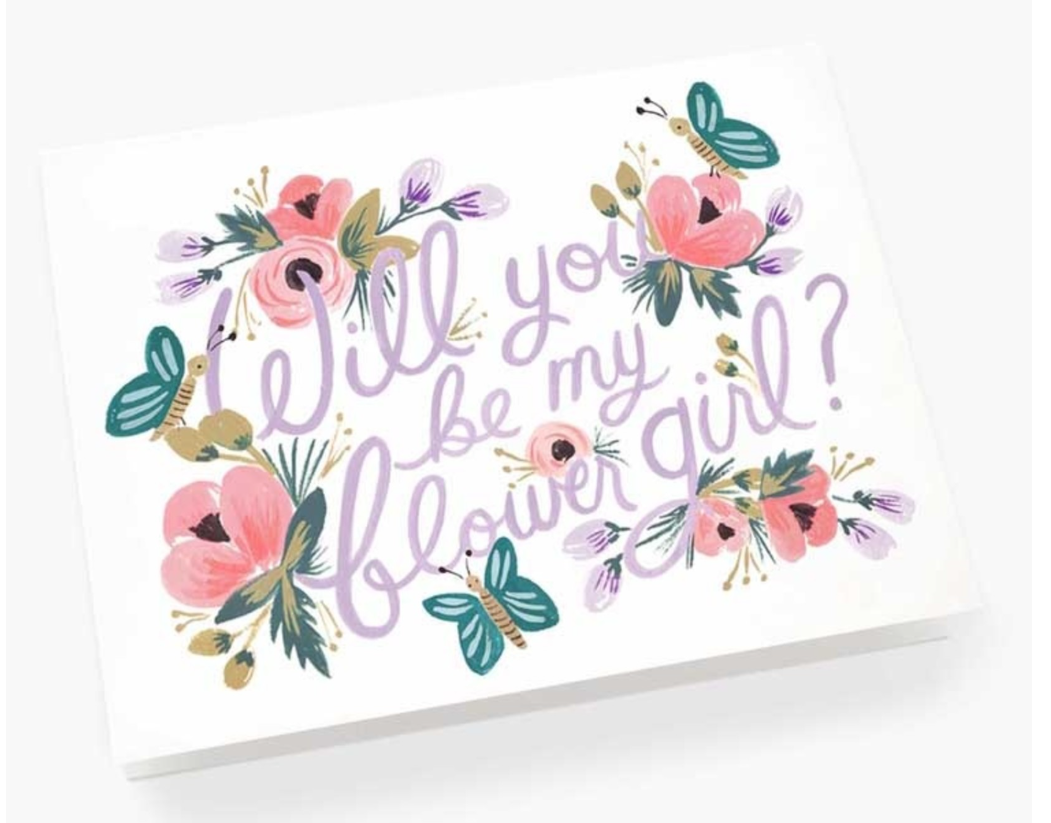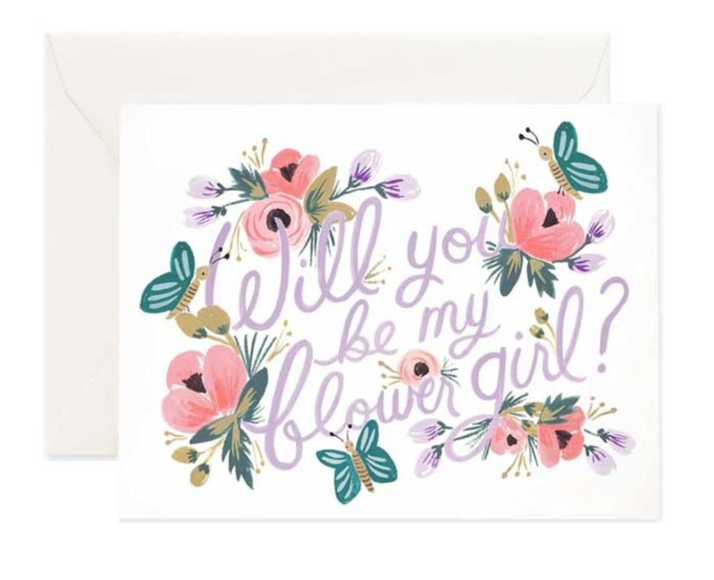 Invite your flower girl to be part of your special day with this enchanting greeting card, beautifully adorned with delicate florals and graceful butterflies. This thoughtful way to ask her to take on this cherished role shows how much her presence means to you. She'll treasure this keepsake as a reminder of the important part she played in your wedding celebration.