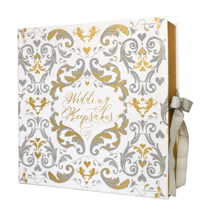Crafted from certified premium recycled cotton paper and bound in a distinguished hard cover, this baroque guest book marries elegance with environmental responsibility. The cover features sophisticated screen-printed detailing in grey and gold, executed with water-based inks for a refined finish. Inside, pristine blank pages await your guests' heartfelt messages, while a soft gray organza ribbon provides a graceful closure. A timeless keepsake that honors both your event and the planet.